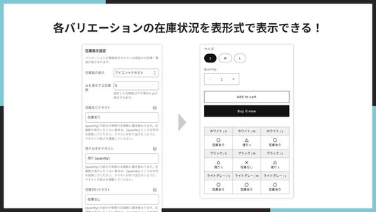 商品ページにバリエーションごとの在庫を一覧表形式で表示できます。顧客が在庫状況を一目で確認できるため、購入体験が向上します。例えば、アパレル商品であれば、S・M・L・XLなどのサイズごと、さらに色違いごとの在庫を整理された表で表示できます。これにより、顧客は自分の欲しいサイズや色の在庫があるかを素早く確認でき、購入の意思決定を迅速に行えるようになります。