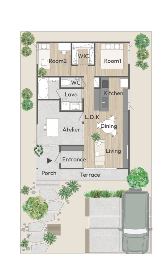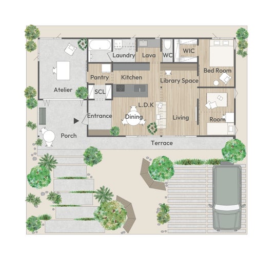 第二弾となる「YUIE ATELIER」は、近年需要が増加しているコンパクトな平屋をベースに、暮らし×アトリエをコンセプトに掲げ、普段の生活とアトリエ(趣味や仕事に没頭できる専用空間)をシームレスにつなげた住まいです。ハイブリッドワークの浸透で増えた「自分の時間」を趣味に使う人や時間や場所に囚われない働き方を望む30代女性(DINKS含む)を主なターゲットとし、日々の生活と利便性の両方をバランスよく取り入れた複数のモデルプランを用意しています。