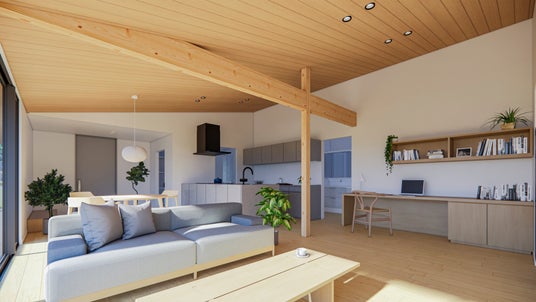 水平梁でアクセントを加えています。勾配天井が開放感を生み出す明るい木質空間は、テラスとつながり、外の光や風を感じられる設計です。