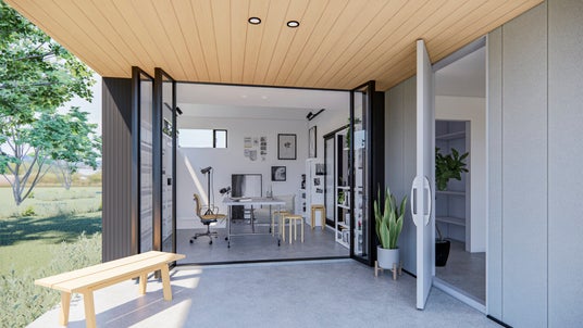 南面のサッシを開け放つことで、アトリエとポーチがひとつながりの空間となり、アトリエの使い方の幅を広げることが可能です。