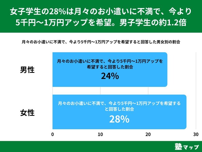 【女子学生の28%は月々のお小遣いに不満で、今より5千円~1万円アップを希望。男子学生の約1.2倍】