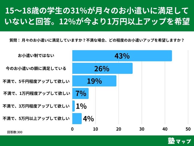 15~18歳の男女を対象とした「月々のお小遣いに満足していますか?不満な場合、どの程度のお小遣いアップを希望しますか?」というアンケートで最も多かった回答は「お小遣い制ではない」で43%でした。