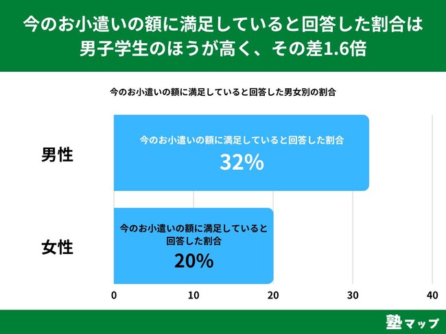 【今のお小遣いの額に満足していると回答した割合は男子学生のほうが高く、その差1.6倍】