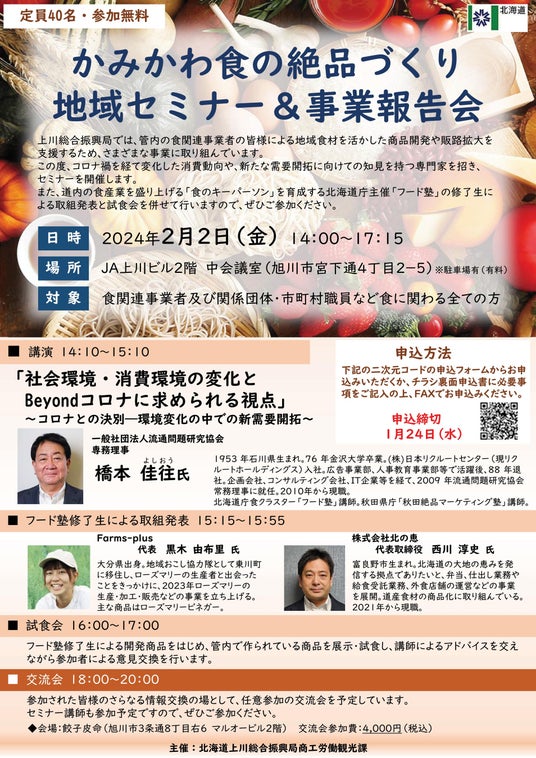 コロナ禍を経て変化した消費動向や新たな需要開拓に向けての知識を持つ専門家を招いたセミナー、道内の食産業を盛り上げる「食のキーパーソン」を育成する北海道庁主催のフード塾の修了生による取組発表・試食会を同時開催します。