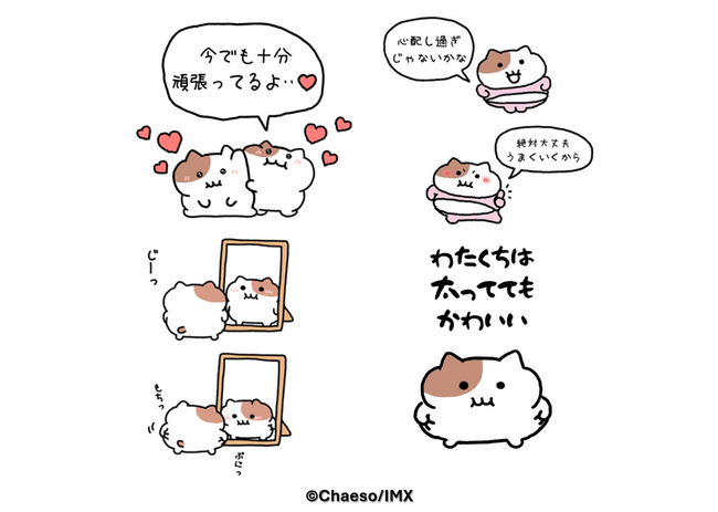 『もちにゃみ』は食べ物が大好きでダイエットに何度も失敗してしまうが、それもまたポジティブに考える前向きな性格で見る人がくすっと笑い共感できる物語や落ち込んでいる人、疲れている人を慰めるような心の癒しになるストーリー展開と親しみやすく可愛らしい猫のキャラクターで多くの支持を得ています。「今でも十分頑張ってるよ」「絶対大丈夫!うまくいく」などといった、日々の原動力になる言葉で癒してくれる『もちにゃみ』の今後の展開をお見逃しなく!