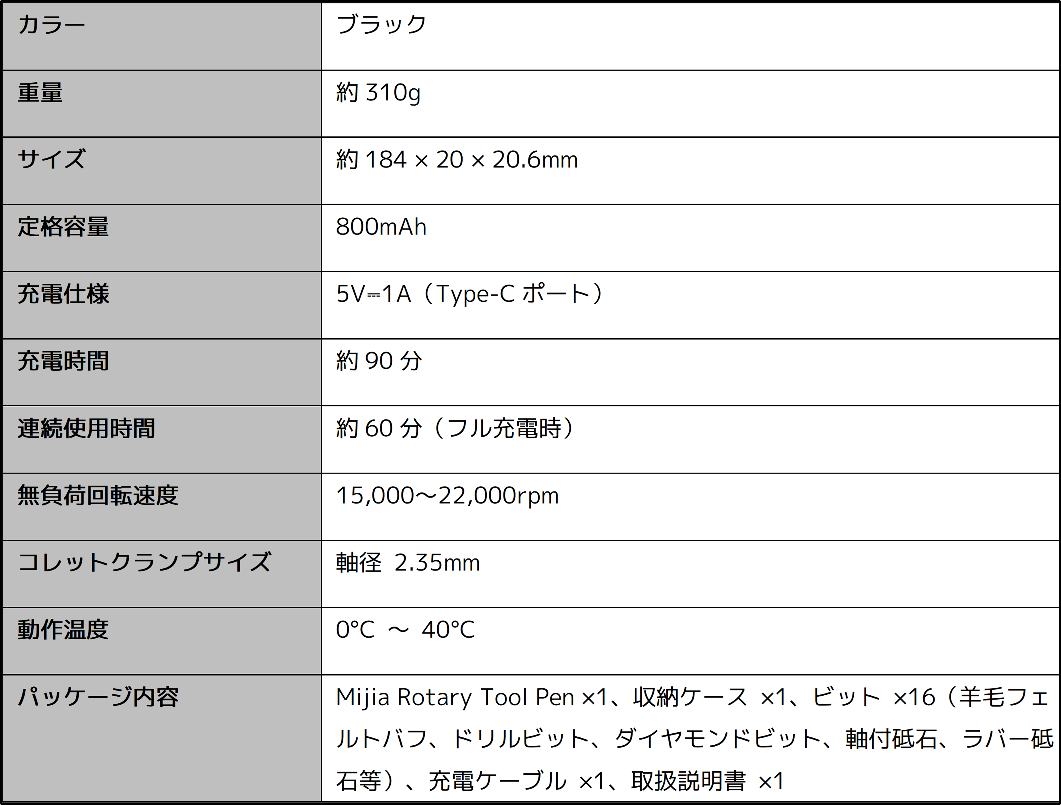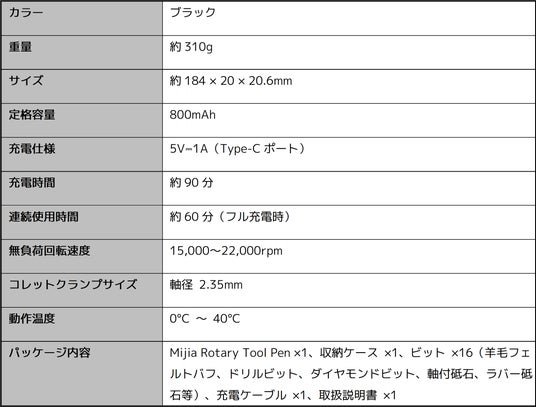 耐久性と安定性に優れた「ブラシレスコアレスモーター」を搭載し、最大22,000rpmの高速回転による精密なパフォーマンスを発揮します。電源ボタンと速度調整ノブのみのシンプル設計で、初心者でも直感的に操作可能。また、800mAhのバッテリーを内蔵し、フル充電で約60分間の連続使用ができるほか、電源に接続しながらの給電駆動にも対応しているため、長時間の創作活動も中断することなく楽しめます。