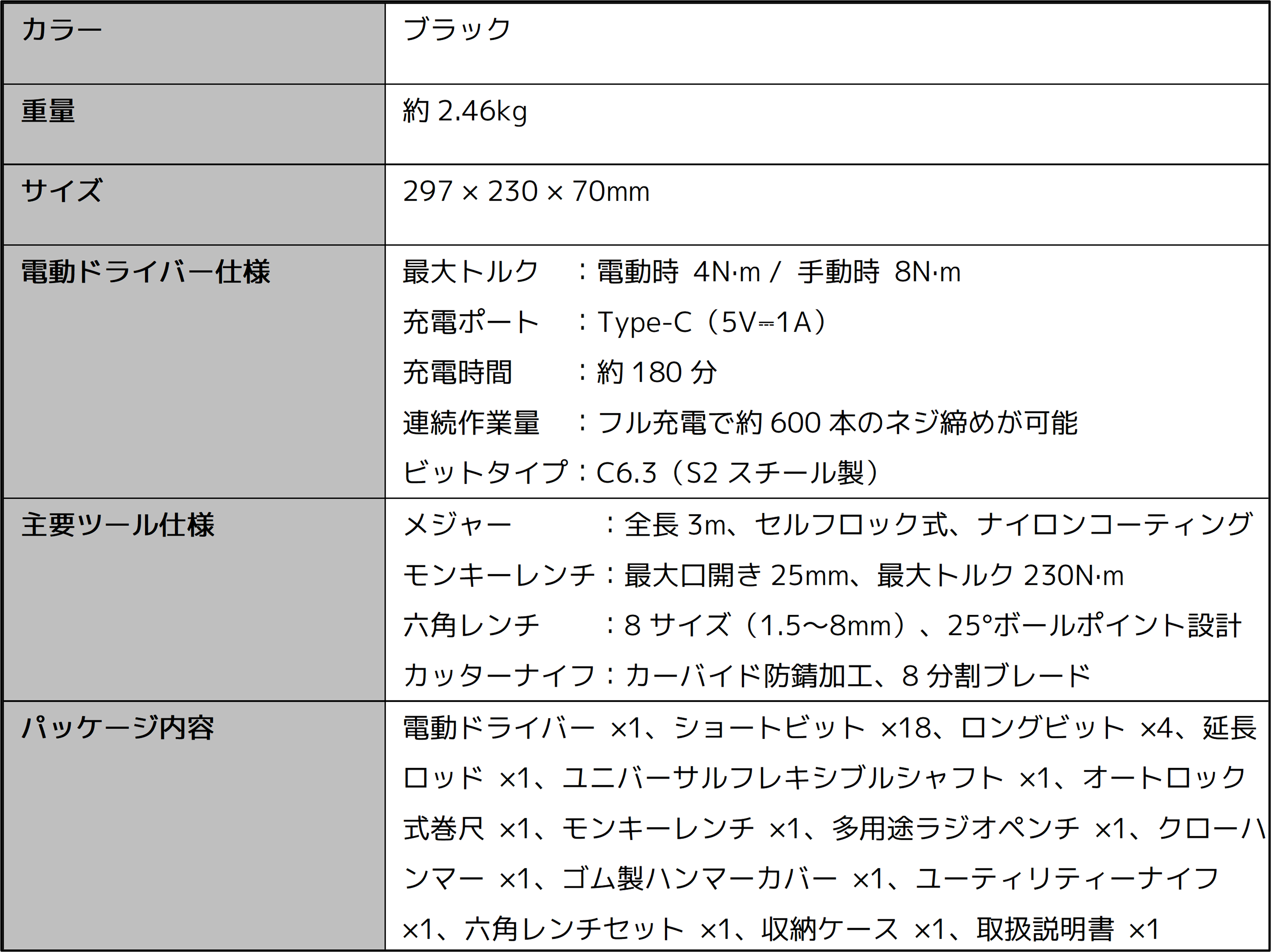 付属の電動ドライバーは、3段階のトルク設定(最大4N・m)とLEDライトを搭載。Type-C充電に対応し、フル充電で約600本のネジ締めが可能です。バッテリー切れの際も、全金属製の遊星ギアボックスにより手動(最大8N・m)での作業が継続できます。また、高品質なS2スチール製のビット22本、狭い場所で活躍するフレキシブルシャフト、家具を傷つけないラバーカバー付きの釘抜きハンマーなど、細部まで品質と使いやすさを追求しました。
