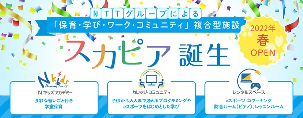 横須賀市にある次世代型ICT教育施設「スカピア」<*1>は、「子どもの成長を促す」「安心して子どもを預けられる」「多彩な習い事を受けられる」「ワーキングスペースで集中して働くことができる」「地域のコミュニティイベントを開催できる」等を実現できる、「保育・学び・ワーク・コミュニティ」をテーマとして、地域課題解決や時代にあわせた新たな子育てスタイルの実現に向けて、2022年4月から各種取り組みを展開しています。