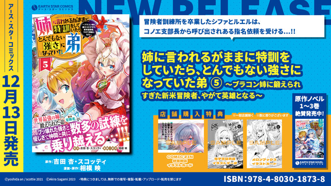 アース・スターノベルにて刊行中のノベルが原作で、現在コミック アース・スター公式サイトにて連載中の人気作品『姉に言われるがままに特訓をしていたら、とんでもない強さになっていた弟~ブラコン姉に鍛えられすぎた新米冒険者、やがて英雄となる~』(原作:吉田 杏・スコッティ 漫画・原作:相模 映)第5巻を12月13日(水)に発売いたします。