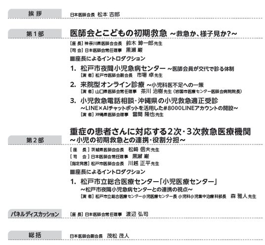 また、指定発言として、こどもの救急対応の体制を堅持するため、地域の砦である病院を守り、地域の健康意識や共生社会を醸成する、地域に根ざした医師会活動の取り組みの重要性が発表されました。