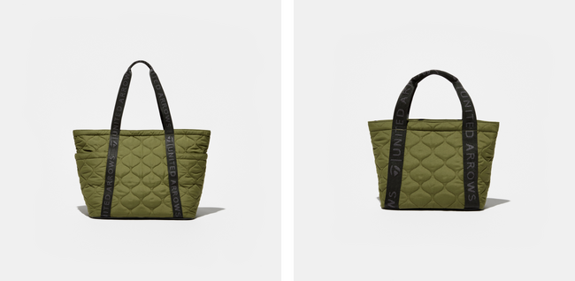 キルティング加工を施した本体に、コラボレーションロゴの持ち手がポイントになった大きめサイズのトートバッグ。外側のメッシュポケットに加え、内側には大きめのメッシュポケットや小物を入れられるファスナー付きの内ポケットなど収納力が高いデザインが特徴。内装生地にはメタルTのモノグラムパターンをプリントしています。