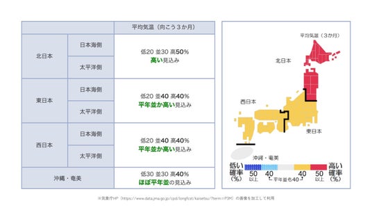 気象庁の3か月予報(2025年3月25日発表)によると、向こう3か月の気温は、暖かい空気に覆われやすいため、北日本では高く、東・西日本では平年並か高いことが見込まれるということです。