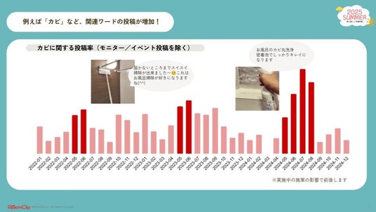 特に「カビ」などの関連ワードを含む投稿が顕著に増加しており、湿気対策への関心の高まりが見られます。これは梅雨から夏にかけての湿度の高い期間において、ユーザーが実用的な解決策を求めていることを示しています。