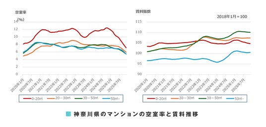 川崎市では、アパート・マンション共に、全面積帯で空室率の改善が継続しています。しかしながら、アパートの支払い賃料は全面積帯で前月比下落、マンションの支払い賃料も0-20平方メートル 、30-50平方メートル で前月比下落しています。支払い賃料が前月比で上昇したマンションの20-30平方メートル 、50平方メートル -についても、前年同月比では下落しています。家賃の高い物件が敬遠され始めている、もしくは家賃を下げて空室を埋めている物件が増加している可能性が考えられます。