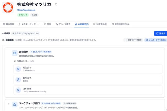 部署ごとの役割やミッション、キーパーソンの経歴・関心領域・メディア露出までを統合し、