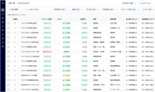 次世代型営業DXプラットフォーム「Mazrica(マツリカ)」をはじめとしたプラットフォームを開発・提供する株式会社マツリカ(本社:東京都中央区、代表取締役CEO:黒佐英司)は、2025年11月1日、営業特化型AI企業データベース「Mazrica Target(マツリカターゲット)」の提供を開始したことをお知らせします。本プロダクトは、データ統合からリスト作成、個社特化の提案作成、活動フィードバックまでを一気通貫で支援します。「どの顧客に、どの商品を、どう話すか」をAIが迅速に判断しサポートすることで、チーム全体の営業力強化につながります。