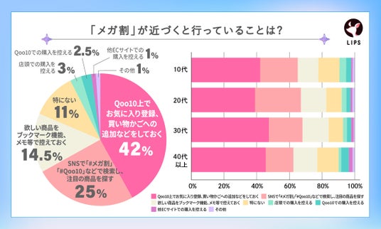 次に回答数の多かったのが、「SNSで「#メガ割」「#Qoo10」などで検索し、注目の商品を探す・・・25%」、「欲しい商品をブックマーク機能、メモ等で控えておく・・・14.5%」となっており、商品の事前調査や購入アイテムのリストアップ等の準備をしっかり行っている様子がうかがえます。