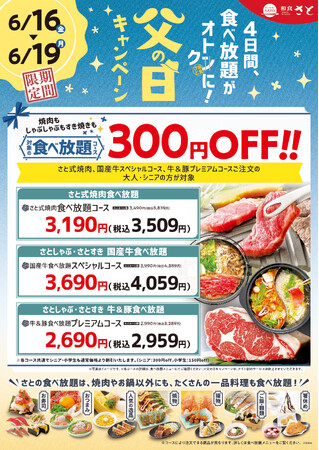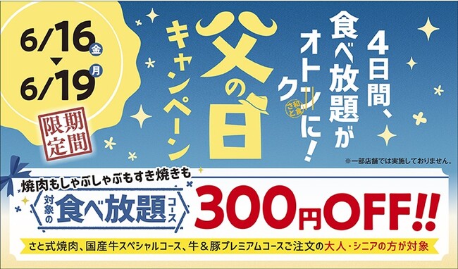 国内197店舗を展開する「和食さと」では、 6月18日(日)の父の日に合わせて、さと式焼肉/しゃぶしゃぶ/すき焼き食べ放題がお得にご利用頂ける「父の日キャンペーン」を開催します。