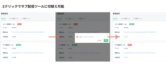 Sharelyを採用いただいたバーチャル株主総会の運営支援では、従前から通信障害のリスクを低減するために、インターネット回線の冗長化を前提に、配信システムもメインとサブの2つを同時に構築してまいりました。この度、株主総会運営事務局側の画面上で、配信システムをメインからサブへ2クリックで切替えができるようになり、通信障害の兆しが見られた際にこれまで以上に迅速な対応・リカバリーが可能になりました。