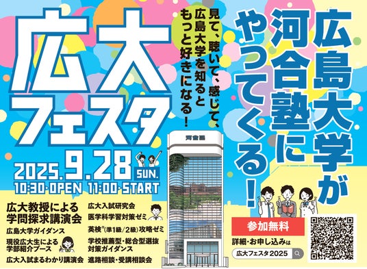 河合塾広島校は、2025年9月28日(日)に広島大学を志望する中学生・高校生とその保護者を対象に、同大学での学びや学校生活、受験対策などを1日で知ることができるイベント「広大フェスタ」を開催します。