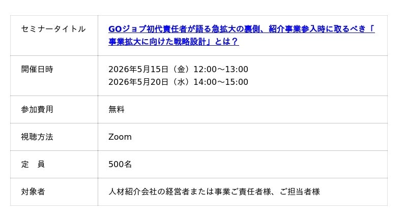 人材ビジネス向けマッチングシステムを提供するポーターズ株式会社(東京都港区、代表 西森 康二)は、ホキラオン株式会社と共同で「GOジョブ初代責任者が語る急拡大の裏側、紹介事業参入時に取るべき「事業拡大に向けた戦略設計」とは?」の再配信を2026年5月15日(金)および20日(水)の計2日程にて実施いたします。