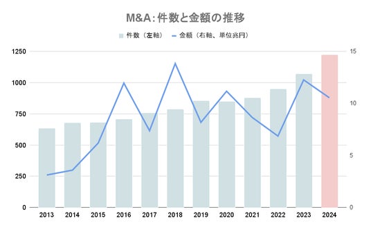 2024年のM&A件数(適時開示ベース)は、前年比14%増の1221件となり、2007年の1169件以来17年ぶりに過去最多を更新しました。取引金額は10兆5397億円で、2年連続で初の10兆円超えを達成しましたが、前年に比べ13.9%減少しました。これは1兆円を超える超大型案件がなかったためです。株式会社ストライクが運営するウェブメディア「M&A Online」が集計しました。