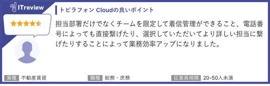「トビラフォン Cloud」は「ITreview」で平均顧客満足度4.3を獲得しています(2026年1月21日時点 91レビュー)。当製品のご利用者様から実際に寄せられたレビューを一部ご紹介します。