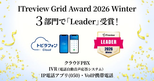 トビラシステムズ株式会社(本社:愛知県名古屋市、代表取締役社長:明田 篤、証券コード:4441、以下「トビラシステムズ」)提供のクラウド型ビジネスフォン「トビラフォン Cloud」が、製品利用者の評価(レビュー)をもとに顧客満足度の高い製品を選定する「ITreview Grid Award 2026 Winter」のクラウドPBX部門、IVR(電話自動音声応答システム)部門、IP電話アプリ(050)・VoIP携帯電話部門の3部門で、最高位の「Leader」を受賞しました。