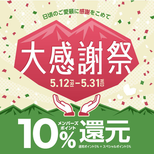 登山・クライミング・アウトドア用品総合専門店、クライミングジムを運営する株式会社好日山荘(本社:兵庫県神戸市、代表取締役社長 松本 良一)は、5月12日(金)より好日山荘全店でメンバーズポイントが10%還元となる「大感謝祭」を開催します。