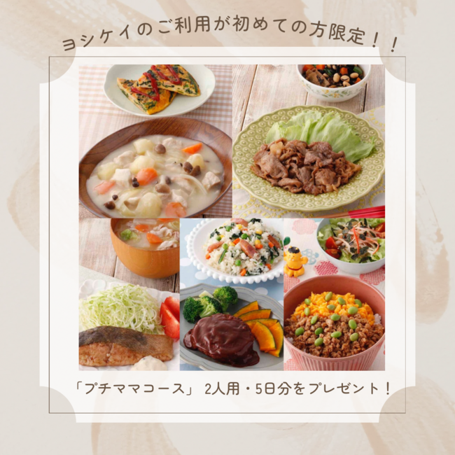 本キャンペーンではヨシケイのミールキット「プチママコース」2人用5日分(月)~(金)を抽選で41名様にプレゼント。プチママコースは小袋調味料や半調理済み商品を活用し20分で主副菜が作れるレシピ内容になっており、調理方法もわかりやすく動画で紹介しているため料理初心者でも簡単に作れます。また、子どもが好きなメニューも多く登場することや、大人用からとりわけで作る離乳食レシピがあることから、子育て世代に人気を博しています。