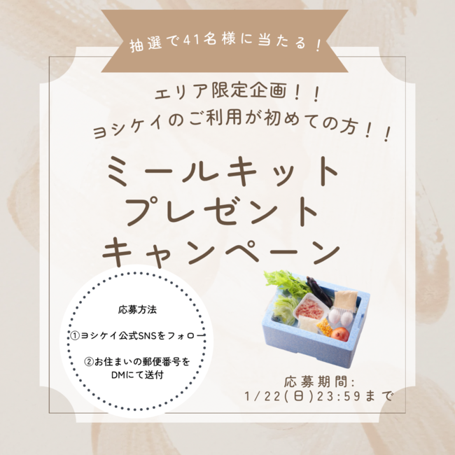 1.ヨシケイ公式SNSアカウントをフォロー 2.お住まいの郵便番号をDMにて送付
