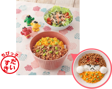 天丼のたれで簡単調味のお手軽そぼろごはん♪副菜のサラダ用にお届けののりで目や口、かにかまでツノを作って節分の鬼の盛り付けにしても◎