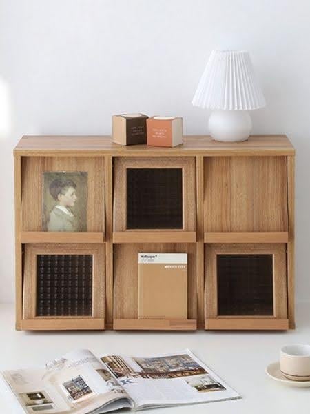 上下に開閉するスライディングフラップドアは、取っ手にポストカードや写真などを飾ることができます。