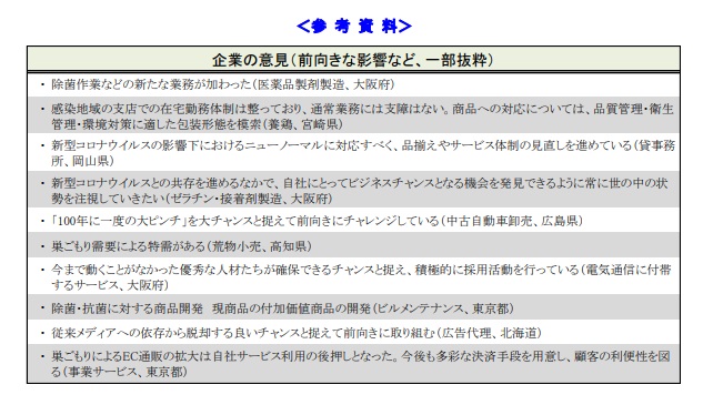 本調査の結果、新型コロナウイルス感染症により業績にマイナスの影響があると見込む企業は7 カ月ぶりに増加に転じたものの、2 カ月連続で 8 割を下回った。政府が推進している各種施策によって一部では明るい兆しもみられたものの、「旅館・ホテル」や「飲食店」などの対人接触型のサービス業やアパレル関連などを中心に、厳しい状況が続いている。一方で、プラスの影響を見込む企業は、内食需要を背景に飲食料品を取り扱う業種で好調が継続。加えて、テレワークなどの拡がりから IT 需要の増加にともない家電や情報機器などを取り扱う企業でもプラスの作用が続いている。さらに、現業を生かして新たな需要の獲得をしている企業も現れている。