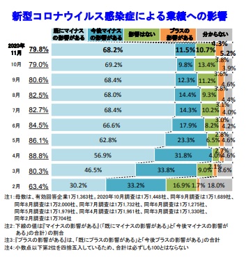 新型コロナウイルス感染症により自社の業績にどのような影響があるか尋ねたところ、『マイナスの影響がある』(「既にマイナスの影響がある」と「今後マイナスの影響がある」の合計)と見込む企業は79.8%となった。前月比0.8ポイント増と、7カ月ぶりに増加に転じたものの、2カ月連続で8割を下回った。