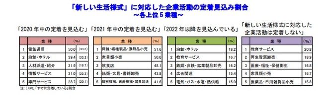 他方、『2020年中の定着を見込む2』企業は、18.3%となった。そのうち、約1割の企業が「すでに定着している」(10.8%)と考えていた。企業からは「テレワークの導入が進み、システムの構築や在宅勤務手当などの整備が完了している」(事業サービス、東京都)という声が聞かれた。とりわけ「電気通信」や「旅館・ホテル」(ともに33.3%)では、3割超の企業で既に定着しているとしており、サービス業を中心にその割合が高い。