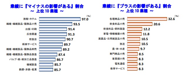 『マイナスの影響がある』を業種別にみると、「旅館・ホテル」が97.0%で最も高い。以下、「繊維・繊維製品・服飾品小売」(93.5%)、「出版・印刷」(91.4%)、「広告関連」(91.3%)、「飲食店」(90.7%)が続く