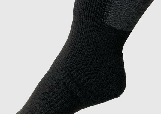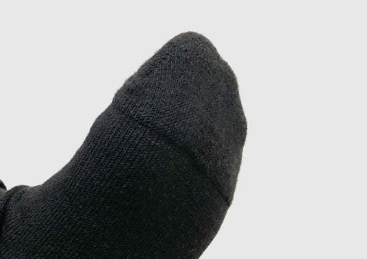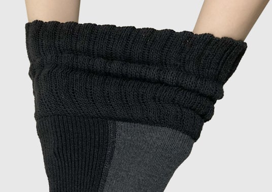 冬のオートバイ乗車時など、走行風で特に冷えやすい「足先」「すね」「ひざ」までしっかりと温めます。全体に伸びのある編み立てで、太もも部分は特に柔らかくフィットします。締めつけ感を抑えつつ、レッグウォーマーや膝ウォーマーがいらないほど、1足でしっかり冷えを防げるのも特長です。