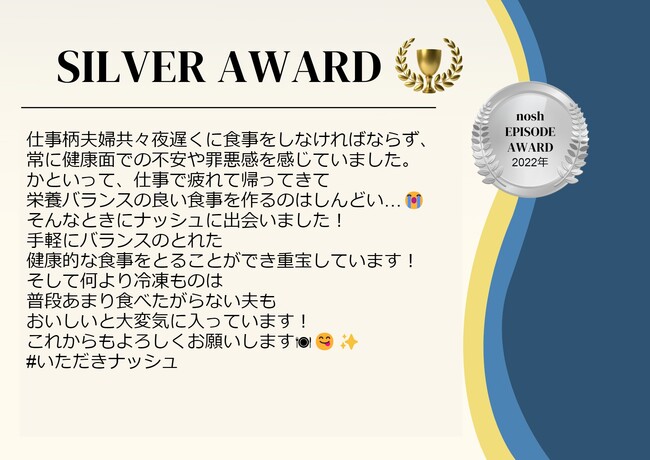 手軽に美味しく栄養管理ができる冷凍宅食サービスのパイオニア「nosh-ナッシュ」は、第2回 noshエピソード AWARD 2022を開催し、noshにまつわるエピソードをTwitterとインスタグラムで募集いたしました。この度、受賞者が発表されましたことをお知らせいたします。