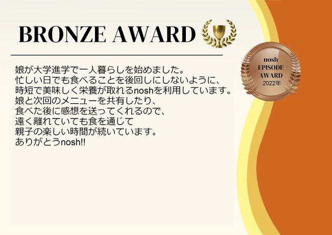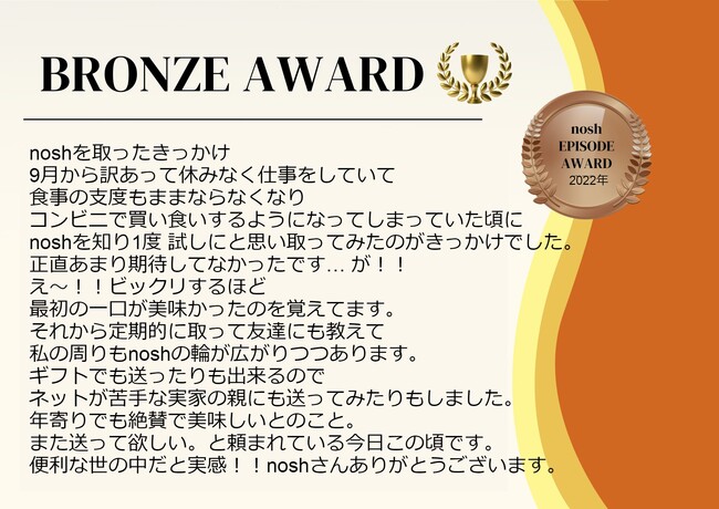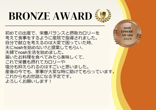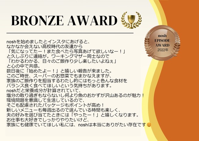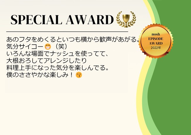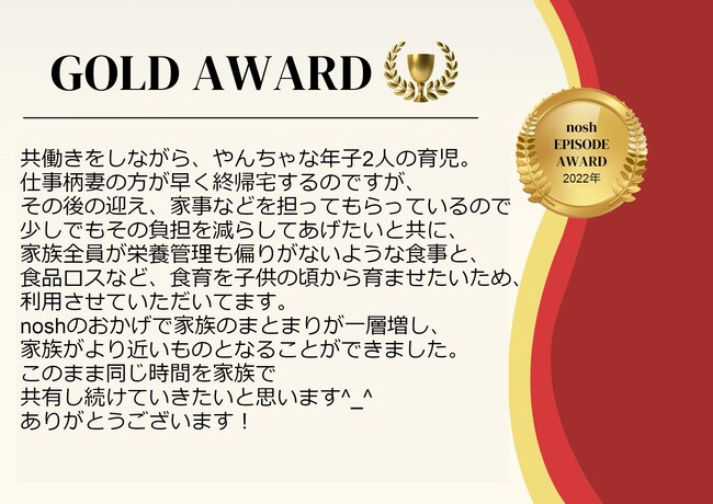 奥様へのお気遣いや、お子様への食育などご家族を大切に想うお気持ちに、noshが寄り添えた素晴らしいエピソードだと思いグランプリに選びました。食品ロス削減については、noshも大切に考えて取り組んでいるところでもあります。今後とも、noshを通して大切な時間をご家族で共有して頂けると幸いです。