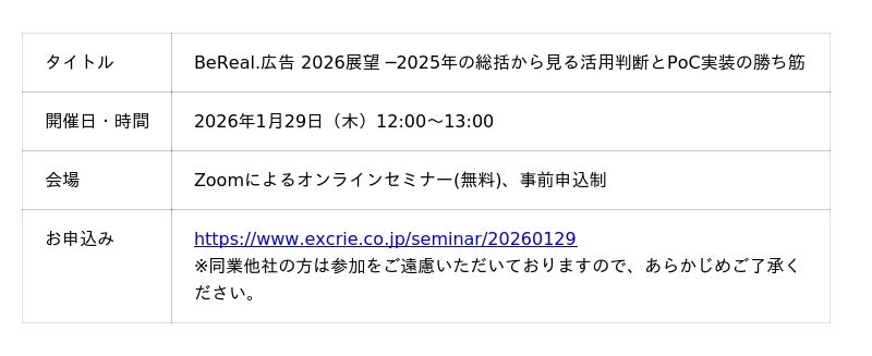 株式会社クロス・マーケティンググループのグループ会社であるソーシャル&セールスプロモーションサービスを展開する株式会社エクスクリエ(本社:東京都新宿区、代表取締役社長:小笠原 亨)は、2026年1月29日(木)に、若年層マーケティングの次なる一手を見極めるためのオンラインセミナー「BeReal.広告 2026展望 ─2025年の総括から見る活用判断とPoC実装の勝ち筋」を開催いたします。