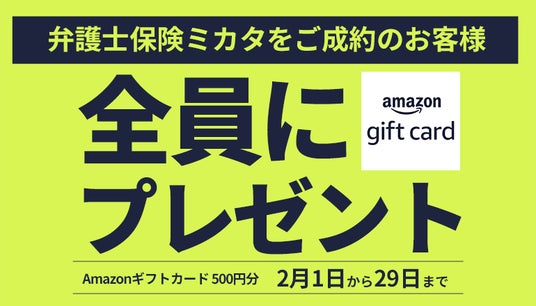 対象期間中に弁護士保険STATION経由で、ミカタ少額短期保険株式会社「弁護士保険ミカタ」の契約申込を完了し、ご契約が成立されたお客様全員に「Amazonギフトカード 500円分」をプレゼントします。