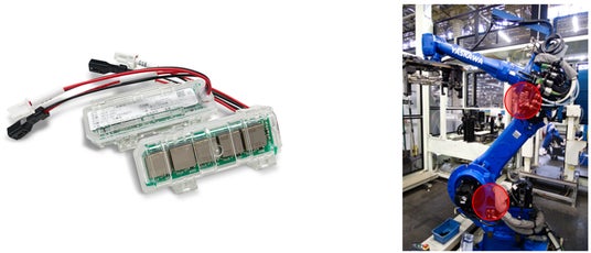 マクセルの全固体電池を搭載した電源モジュール(左)、全固体電池を搭載した産業用ロボット(赤丸の位置に全固体電池の電源モジュールを搭載(*1))(右)