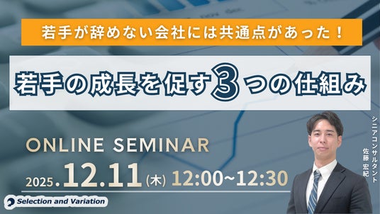 組織・人事コンサルティングファームであるセレクションアンドバリエーション株式会社(以下、当社、東京都千代田区丸の内、大阪市西区、名古屋市西区 / 代表取締役社長:平康慶浩/ URL:https://sele-vari.co.jp/ )は『若手が辞めない会社には共通点があった!若手の成長を促す3つの仕組み』セミナーを2025年12月11日(木)12:00~12:30に開催することをお知らせいたします。