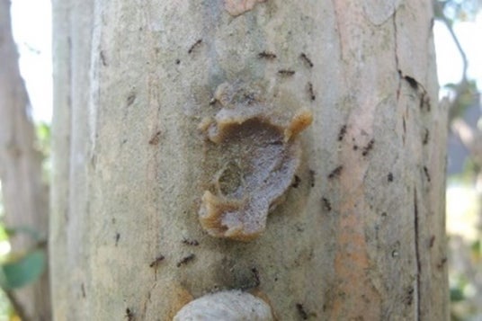 樹木の幹に塗布したぷりっとベイトに群がるアリ