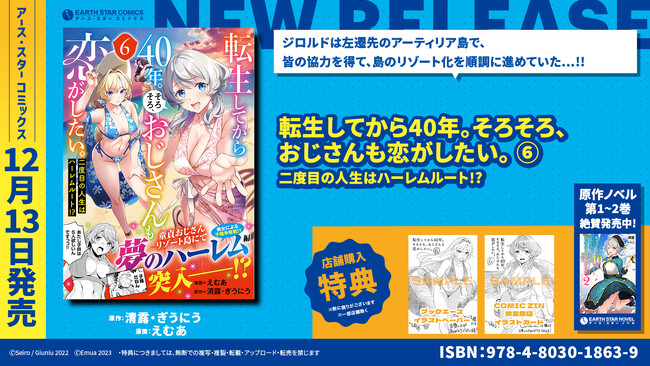 アース・スターノベルにて刊行中のノベルが原作で、現在コミック アース・スター公式サイトにて連載中の人気作品『転生してから40年。そろそろ、おじさんも恋がしたい。 二度目の人生はハーレムルート!?』(原作:清露・ぎうにう 漫画:えむあ)第6巻を12月13日(水)に発売いたします。