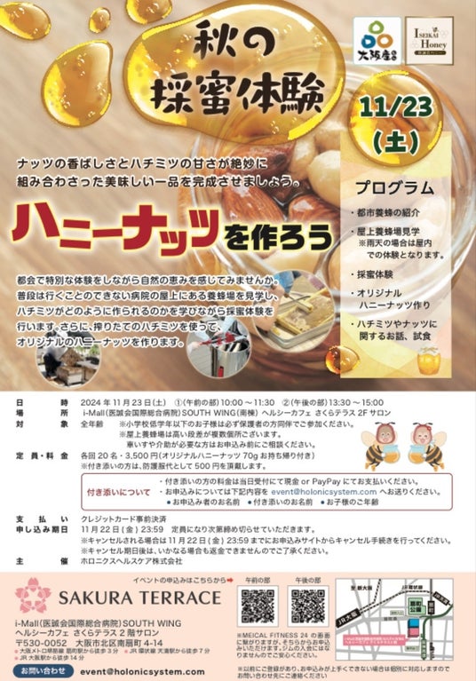 医療法人医誠会(本社:大阪府大阪市、代表者:谷幸治)が運営する「i-Mall」内のヘルシーカフェ さくらテラスで、2024年11月23日(土)に「秋の採蜜体験 ハニーナッツを作ろう」を開催します。都市養蜂に触れながら、普段は立ち入れない病院の屋上にある養蜂場を見学したり、実際に採蜜を体験することもできます。さらに、搾りたてのハチミツを使ってオリジナルの「ハニーナッツ」を作るワークショップを通じて、食の魅力を再発見しませんか。