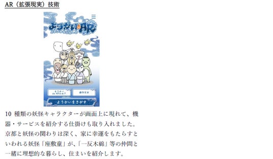住まいのお困りごとを解決する「住ミカタ・サービス」、リノベーションサービス「マイリノ」等、近年Daigasグループが展開するサービスを紹介するエリアを新設します。また、これまで機器の展示が中心だったものを、体験・体感できる展示に刷新します。さらにAR(拡張現実)技術を活用し、スマートフォンでQRコードを読み込むことで、画面上に現れた妖怪キャラクターが機器を紹介する仕掛けも取り入れました。ガス機器の効果を体感いただくと共に、ファミリー層にも楽しんでいただける展示となっています。