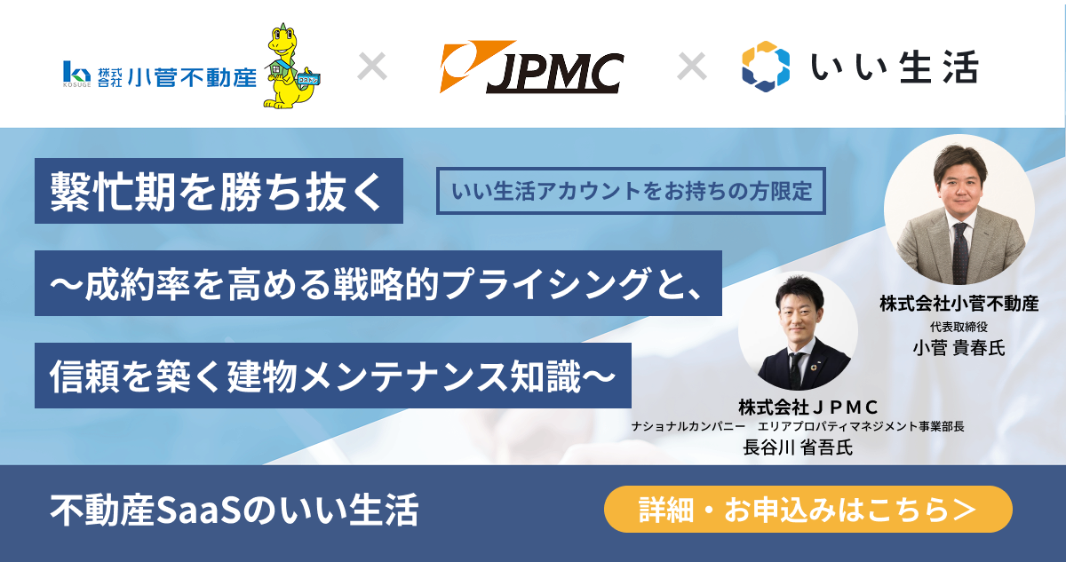 不動産業務を網羅するバーティカルSaaSと業務効率を推進するBPaaS(※1)で不動産市場のDXを推進する株式会社いい生活(東京都港区、代表取締役社長 CEO:前野 善一、東証スタンダード:3796、以下:いい生活)は、1月30日(金)16時から無料セミナー『繁忙期を勝ち抜く ~成約率を高める戦略的プライシングと、信頼を築く建物メンテナンス知識~』を開催いたします。