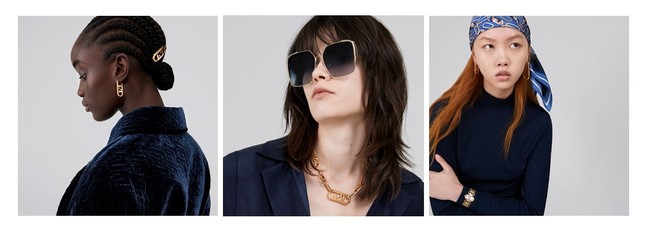 「オーロック」のゴールドメタルのイヤリング、リング、ヘアアクセサリーは、マキシからミニまで多様なサイズを取り揃えその組み合わせによって明確なファッションステートメントとなるようにデザインされています。「オーロック」ロゴが連なったインターレースのチェーンネックレスが、フェンディ ウーマンの力強い感性を反映するジュエリーラインを完璧にしています。